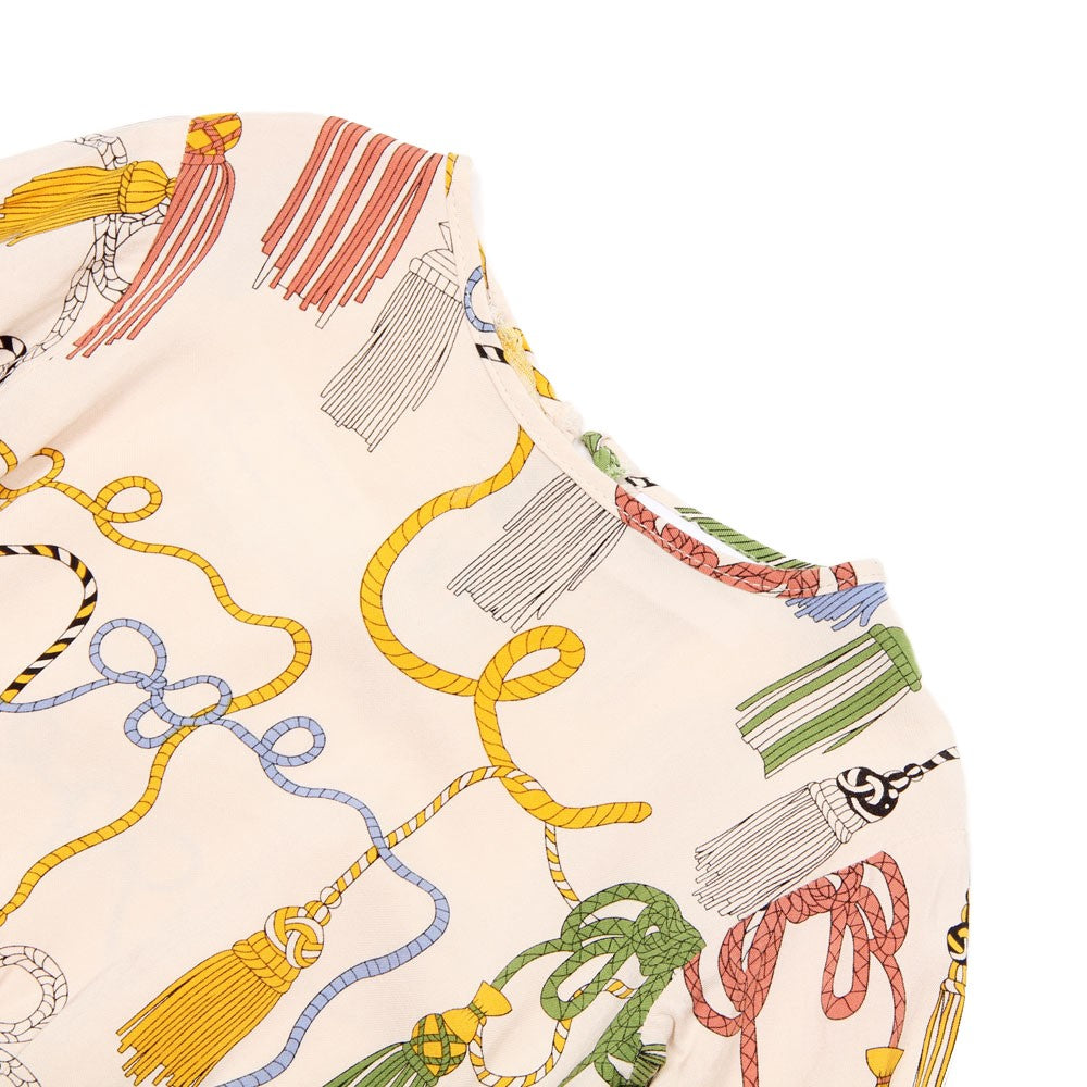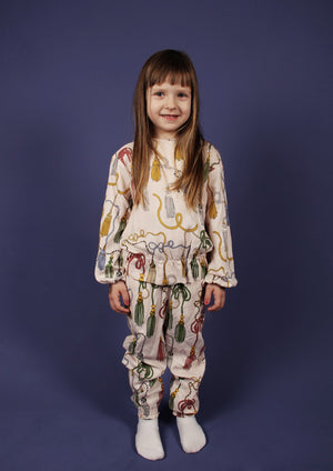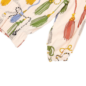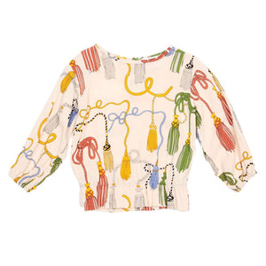 Comfortable and cute blouse with long sleeves. The bright, pastel, tazzel all over print is made fromlight and luxurious viscose. Features lovely details such as large bow at front and dressed button at top back. It has soft elastic at sleeve ends and waist for perfect fit and extra comfort.
